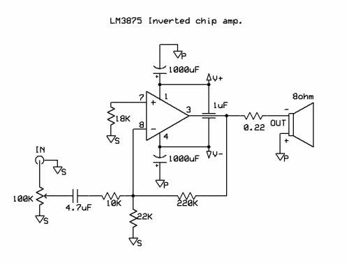 I edited the schematic from the recommendations given by some people at diyAudio. I removed the volume control because the volume will be at the preamp. The output resistor is not needed, and the 1uF decoupling cap is not needed because the 1000uF will be very close to the IC. I risk having no DC blocking cap in the input because most cheaper caps degrade the sound by a lot.