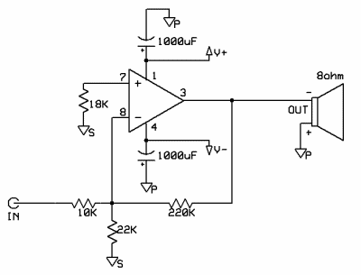 There is no need for large caps, in fact the recommended value is only 1000uF, which makes the whole amp very small. Yet even with such few components, it is a very good sounding amp – many people say so.